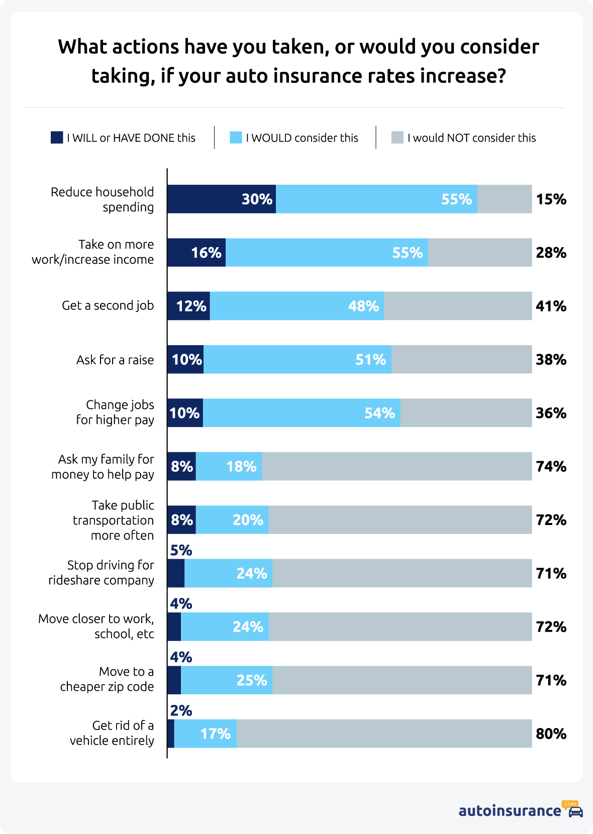 Reducing household spending has been the primary method for accommodating higher insurance costs. One-third of drivers have already cut back their budgets, and another 55 percent would consider doing the same.